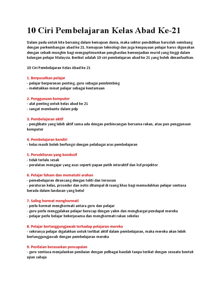10 ciri pembelajaran kelas abad ke 21. Amalan dan pelaksanaan di sekolah. Berikut adalah 10 ciri pembelajaran abad ke 21 yang boleh dimanfaatkan. 10 ciri pembelajaran kelas abad ke 21: Menurut international society for technology in education karakteristik keterampilan guru abad 21 dimana era informasi menjadi ciri utamanya.