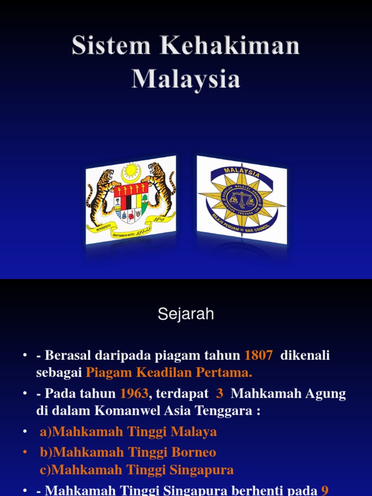 Untuk melaksanakan tugas2 kehakiman di negara ini,sistem mahkamah telah. Malaysian law as the law of reference and malaysian courts and arbitrators as the forum for settlement of disputes. Malaysia mengamalkan sistem demokrasi berparlimen di bawah pentadbiran raja berperlembagaan yang diketuai oleh seri paduka baginda yang sistem demokrasi berpalimen ini terdiri daripada perundangan, kehakiman dan pentadbiran. Kekuasaan kehakiman di malaysia diselenggarakan oleh sebuah sistem kehakiman yang berdasarkan kepada common law (hukum umum) dari warisan penjajahan inggris dan hukum islam yang termuat dalam konstitusi malaysia. Sebelum 1946, terdapat 3 mahkamah agung: