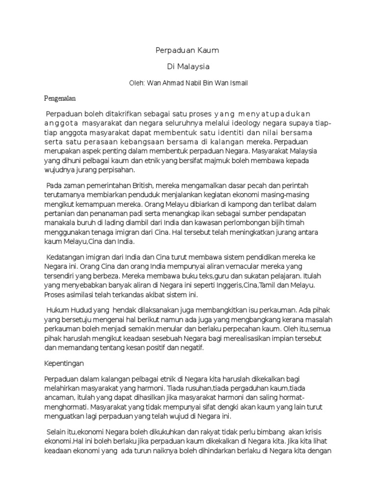 Perpaduan kaum sukar diwujudkan apabila inggeris mula campur tangan dalam pentadbiran di tanah melayu pada tahun 1824. Malaysia sebelum berdiri teguh sebagai negara membangun telah melalui pengalaman pahit. Dengan mengamalkan perpaduan kaum, kita juga dapat memajukan ekonomi negara. Namun persoalannya, apakah kepentingan mengamalkan perpaduan kaum dalam kalangan masyarakat? Tanpa perpaduan kaum, kita tidak dapat membawa negara kita ke tahap kemajuan yang optimum. Salah satu kepentingan perpaduan kaum adalah bagi menjamin keamanan negara. Sihat dan bertentangan dengan ajaran islam. Perpaduan kaum juga memainkan peranan dalam mengukuhkan lagi ekonomi negara dengan penglibatan semua kaum dalam kegiatan ekonomi. Pelajar (56.7%) mengatakan novel bukit kepong sahaja yang mencerminkan. Kita tiada dol said untuk menentang kemaraan penjajah pada tahun 1826 di naning, atau rentap menentang kubu raja brooke di nanga skrang pada tahun 1983, dato' maharajalela membunuh. Tanpa perpaduan semua kaum keamanan di sabah tidak akan dapat diwujudkan sehingga sekarang dan bila semangat perpaduan tidak diamalkan ianya boleh menghancurkan keamanan sesebuah negara. Penjajahan british mengamalkan dasar pecah dan perintah yang menghalang perpaduan dalam kalangan masyarakat pelbagai kaum yang berbeza adat resam, keturunan, agama. Oleh itu tidak perlulah kita melihat perayaan yang disambut oleh kaum lain sesuatu yang pelik, kerana menyambut.